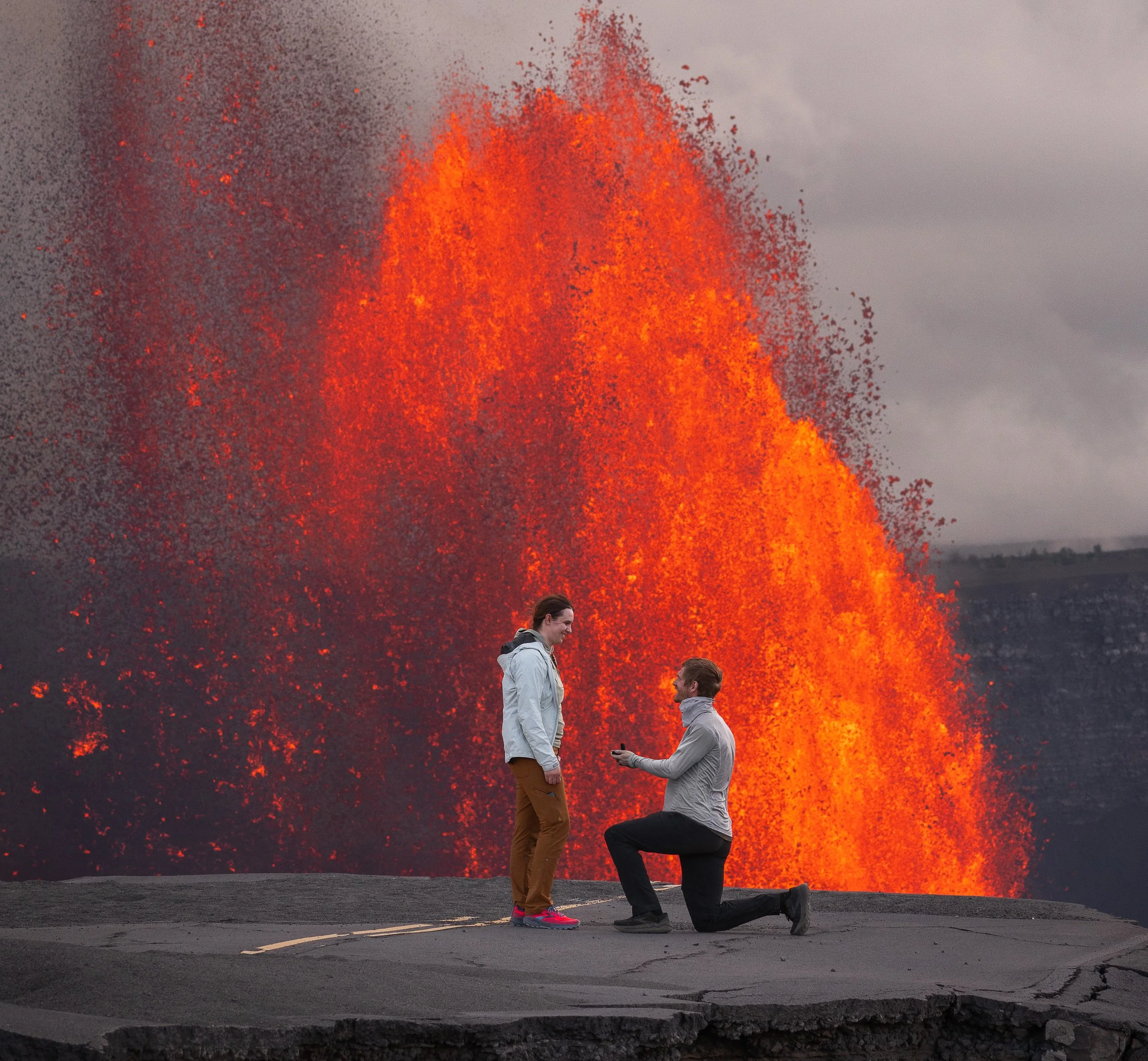 Photographer Mark Stewart Proposes to his Fiancé and second Photographer Olivia Post In front of the Erupting Lava Fountain of Kilauea. This image was taken on time lapse with our own cameras.
